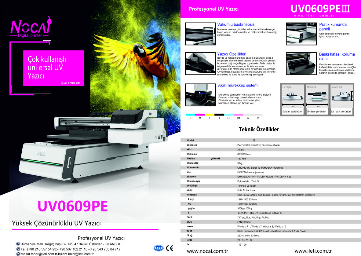 Yeni nesil özgün tasarım ve kolay kullanım özelliğini ve fiyat avantajını birleştiren Nocai NC-UV0609PEIII UV baskı makinası sektöre yeni bir soluk verecek. Nocai UV yazıcı modellerinin en son versiyonu yeni nesil NC-UV0609PEIII aynı anda renk, beyaz ve lak basma özelliği, 18 cm baskı yüksekliği, opsiyonel yuvarlak materyallere baskı aparatı, vakum tablosu ve diğer özellikleri ile işletmenizin tüm ihtiyaçlarını karşılamak amacıyla üretilmiştir. Nocai UV baskı makineleri fotoğraf kalitesinde baskı özelliği ve küçük detayları bile basma yeteneği ile her sektöre hitap etmektedir.
